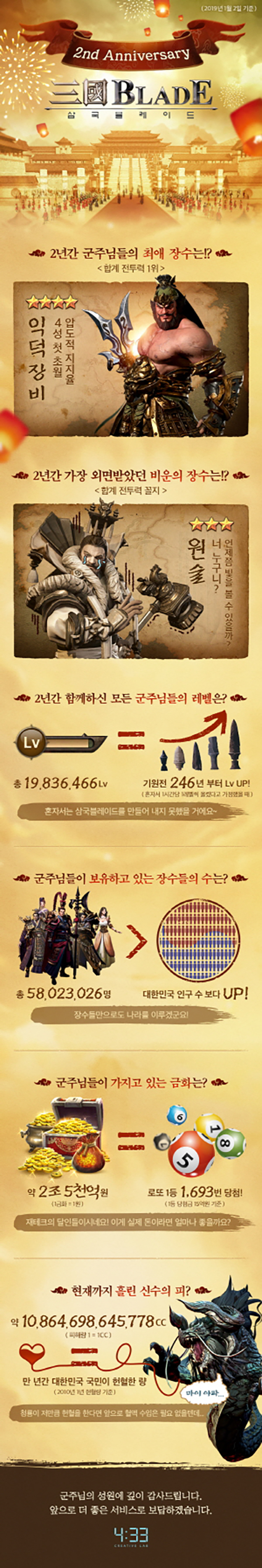 ³×½Ã»ï½Ê»ïºÐ(ÀÌÇÏ 4:33)Àº ¸ð¹ÙÀÏ ¼öÁýÇü RPG »ï±¹ºí·¹À̵å(°³¹ß»ç ¾×¼Ç½ºÄù¾î)ÀÇ ¼ºñ½º 2ÁÖ³âÀ» ±â³äÇÏ´Â ÀÎÆ÷±×·¡ÇÈÀ» °ø°³ÇÏ°í ¾÷µ¥ÀÌÆ®¸¦ ÁøÇàÇß´Ù.