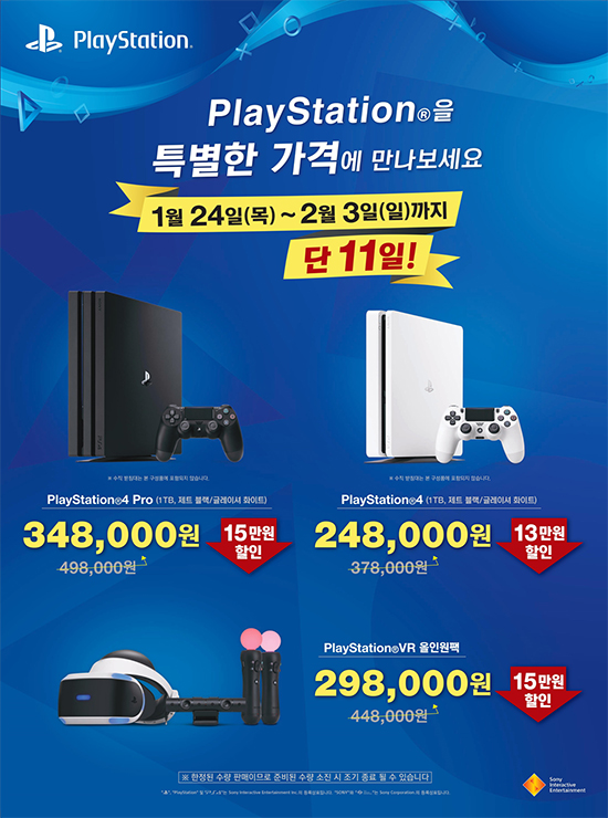ÇØ´ç ±â°£ µ¿¾È PS4¢â Pro 1TB´Â 348,000¿ø(Á¤»ó ÆÇ¸Å°¡ 498,000¿ø), PS4¢â 1TB´Â 248,000¿ø(Á¤»ó ÆÇ¸Å°¡ 378,000¿ø), PS VR All-in-one-packÀº 298,000¿ø(Á¤»ó ÆÇ¸Å°¡ 448,000¿ø)¿¡ ÆÇ¸ÅµÈ´Ù.