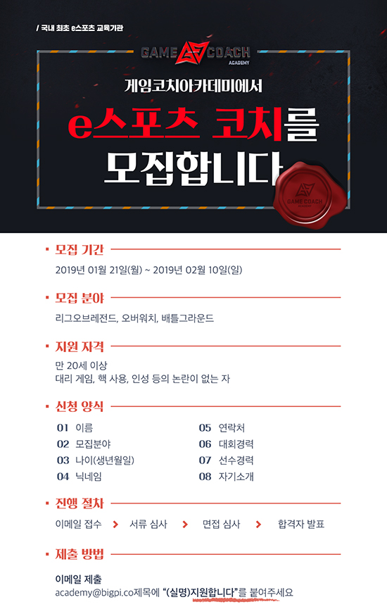 °ÔÀÓÄÚÄ¡¾ÆÄ«µ¥¹ÌÀÇ ÄÚÄ¡·Î Áö¿øÇϱâ À§Çؼ´Â À̸§ / ³ªÀÌ(»ý³â¿ùÀÏ) / ´Ð³×ÀÓ / ¿¬¶ôó / ´ëȸ °æ·Â / ¼±¼ö °æ·Â / ÀÚ±â¼Ò°³¸¦ ÀÛ¼ºÇÏ¿© academy@bigpi.co·Î ½ÅûÀ» ÇÏ¸é µÇ¸ç, ¸ÞÀÏ Á¦¸ñ¿¡ ¡°(½Ç¸í) Áö¿øÇÕ´Ï´Ù¡± ¾ç½ÄÀ» ÀûÀ¸¸é µÈ´Ù.