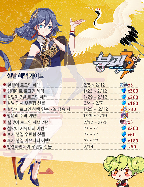 ¶ÇÇÑ, ¿À´Â 2¿ù 4ÀϺÎÅÍ 7ÀϱîÁö °ÔÀÓ¿¡ Á¢¼ÓÇÒ ½Ã¿¡´Â ¿ìÆíÇÔ¿¡¼ 180 ¼öÁ¤ ¼±¹°À» ¹ÞÀ» ¼ö ÀÖÀ¸¸ç, ¿À´Â 2¿ù 19ÀϱîÁö´Â ¸ÞÀÎ ½ºÅ丮¿Í ¿¬´ë±â ½ºÅ×ÀÌÁö, ÄÚ½ºÆ¬ üÇè ½ºÅ×ÀÌÁö¿¡ ÇÊ¿äÇÑ Ã¼·Â ¼Ò¸ð·®ÀÌ ¹ÝÀ¸·Î °¨¼ÒµÇ´Â ÇýÅõµ ´©¸± ¼ö ÀÖ´Ù. ÀÌ¿Í ÇÔ²² ÇÁ·Î¸ð¼Ç ±â°£ µ¿¾È À̺¥Æ® ÀÓ¹«°¡ »õ·Ó°Ô °³¹æµÇ¾î À̸¦ ÅëÇØ ¼ºÈç ¡®ÈÄÄ«¡¤»õÇØ (»ó)¡¯°ú 1/3 °áÁ¤ µîÀÇ ÇªÁüÇÑ ¾ÆÀÌÅÛÀ» ¹Þ¾Æº¼ ¼ö ÀÖ´Â ´Ùä·Î¿î Áñ±æ °Å¸®¸¦ ¸¸³ªº¼ ¼ö ÀÖ´Ù.