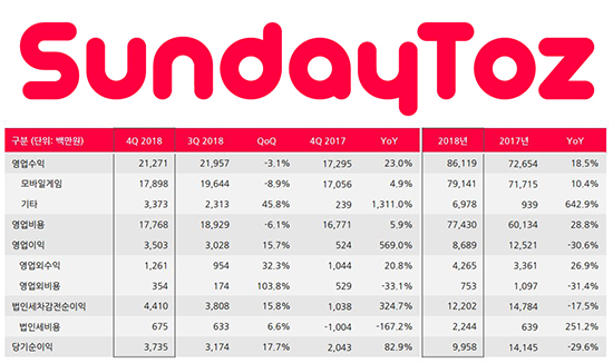¼±µ¥ÀÌÅäÁî´Â 2018³â 4ºÐ±â ¸ÅÃâ 213¾ï ¿ø, ¿µ¾÷ÀÌÀÍ 35¾ï ¿ø, ´ç±â¼øÀÌÀÍ 37¾ï ¿øÀ» ±â·ÏÇß´Ù°í ÀüÇϸç Á÷Àü ºÐ±â ´ëºñ ¸ÅÃâ 3% °¨¼Ò, ¿µ¾÷ÀÌÀͰú ´ç±â¼øÀÌÀÍÀº °¢°¢ 16%, 18% Áõ°¡Çß´Ù°í ¹àÇû´Ù. ÀÌ´Â Àü³â µ¿±â ´ëºñ ¸ÅÃâ 23%, ¿µ¾÷ÀÌÀÍ 569%, ´ç±â¼øÀÌÀÍ 83%°¡ Áõ°¡ÇÑ ½ÇÀûÀÌ´Ù.
