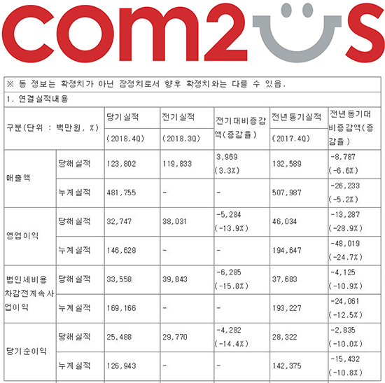 ÄÄÅõ½º´Â ½ÇÀû°ø½Ã¸¦ ÅëÇØ 2018³â 4ºÐ±â ¸ÅÃâ 1,238¾ï ¿ø, ¿µ¾÷ÀÌÀÍ 327¾ï ¿ø, ´ç±â¼øÀÌÀÍ 255¾ï ¿øÀ» ±â·ÏÇß´Ù°í ¹àÇû´Ù.
