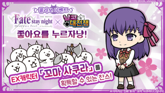 ±ØÀåÆÇ'Fate/stay night [Heaven's Feel]'¿Í '³ÉÄÚ´ëÀüÀï'ÄÝ¶óº¸ °áÁ´À» ±â³äÇÏ¿© facebook SNS Ä·ÆäÀÎ À» °³ÃÖÇϰí 「#³ÉÄÚÆäÀÌÆ®Äݶóº¸」 °Ô½Ã±ÛÀÇ 「ÁÁ¾Æ¿ä」 °¹¼öÀÇ ÇÕ°è°¡ 5,000°ÇÀ» ´Þ¼ºÇÏ¸é °ÔÀÓ ³»¿¡¼ »ç¿ëÇÒ ¼ö ÀÖ´Â EX ij¸¯ÅÍ 「²¿¸¶ »çÄí¶ó」¸¦ ȹµæÇÒ ¼ö ÀÖ´Ù. ¶ÇÇÑ 「ÁÁ¾Æ¿ä」ÀÇ ´Þ¼º °¹¼ö¿¡ µû¶ó '³ÉÄÚ´ëÀüÀï' °ÔÀÓ ³» ¾ÆÀÌÅÛµµ ¼±¹°ÇÑ´Ù.