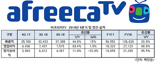 ¾ÆÇÁ¸®Ä«TV°¡ ¿¬°á ±âÁØ 2018³â ¿¬°£ ¸ÅÃâ¾×°ú ¿µ¾÷ÀÌÀÍÀÌ °¢°¢ 1,266¾ï¿ø°ú 271¾ï¿øÀ» ±â·ÏÇß´Ù°í ¹àÇû´Ù. Àü³â ´ëºñ ¸ÅÃâ¾×Àº 33.9%, ¿µ¾÷ÀÌÀÍÀº 48% Áõ°¡Çß´Ù. 2018³â ´ç±â¼øÀÌÀÍ ¶ÇÇÑ 213¾ï¿øÀ» ±â·ÏÇϸç Áö³ÇØ ´ëºñ 45.5% »ó½ÂÇß´Ù.