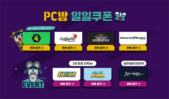 À̹ø¿¡ Ãß°¡ÇÑ ÄíÆù Á¦°ø °ÔÀÓÀº ¡®Ä«Æ®¶óÀÌ´õ¡¯, ¡®¼µç¾îÅá¯, ¡®Ãµ¾Ö¸í¿ùµµ¡¯, ¡®¹öºíÆÄÀÌÅÍ¡¯, ¡®Ä«¿îÅͽºÆ®¶óÀÌÅ© ¿Â¶óÀΡ¯ 5Á¾ÀÌ´Ù. ±âÁ¸ÀÇ ¡®EA SPORTS¢â FIFA Online 4¡¯¿Í ¡®¸ÞÀÌÇýºÅ丮¡¯¸¦ Æ÷ÇÔÇØ PC¹æ Á¡À¯À² 10À§ À̳» °ÔÀÓ Áß 4Á¾ÀÇ ÄíÆùÀ» Á¦°øÇϸç ÇýÅà ¹üÀ§¸¦ °ÈÇß´Ù.