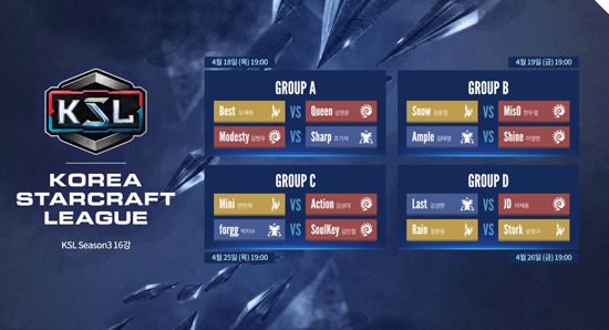 ¡®Mini¡¯ º¯ÇöÁ¦, ¡®Action¡¯ ±è¼º´ë, ¡®forgg¡¯ ¹ÚÁö¼ö, ¡®Soulkey¡¯ ±è¹Îö ¼±¼ö°¡ ¼ÓÇØ ÀÖ´Â ±×·ìCÀÇ °æ±â´Â 4¿ù 25ÀÏ¿¡, ¡®Last¡¯ ±è¼ºÇö, ¡®JD¡¯ ÀÌÁ¦µ¿, ¡®Rain¡¯ Á¤À±Á¾, ¡®Stork¡¯ ¼Ûº´±¸ ¼±¼ö°¡ ¼ÓÇØ ÀÖ´Â ±×·ìDÀÇ °æ±â´Â ´ÙÀ½³¯ÀÎ 4¿ù 26ÀÏ¿¡ ÁøÇàµÉ ¿¹Á¤ÀÌ´Ù. ±×·ì DÀÇ °æ¿ì KSL ù ½ÃÁðÀÇ ¿ì½Â ¹× ÁØ¿ì½ÂÀ» °¢°¢ Â÷ÁöÇÑ ±è¼ºÇö°ú ÀÌÁ¦µ¿, ÃÖ° ÇÁ·ÎÅ佺 ¼±¼ö·Î ¾Ë·ÁÁø Á¤À±Á¾°ú ¼Ûº´±¸°¡ ¸ðµÎ ¼ÓÇØ ÀÖ¾î ¼±¼öµé°ú ÆÒµé »çÀÌ¿¡¼ ÀÌ¹Ì Á×À½ÀÇ Á¶·Î ºÒ¸®°í ÀÖ´Ù.