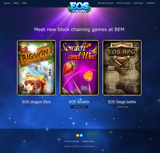 ¿ì¼± 5¿ù Áß »çÀÌÆ® ¿Àǰú ÇÔ²² ¼±º¸ÀÏ °ÔÀÓ µð¾Û(dApp, Å»Áß¾ÓÈ ¾ÖÇø®ÄÉÀ̼Ç)Àº ÁÖ»çÀ§ º£ÆÃ°ÔÀÓÀÎ ¡®ÀÌ¿À½º µå·¡°ï ´ÙÀ̽º(EOS dragon Dice)¡¯¿Í ¡®ÀÌ¿À½º ½ºÅ©·¡Ä¡(EOS Scratch)¡¯ 2Á¾ÀÌ´Ù. ÀÌÈÄ °íÄ÷¸®Æ¼ ºí·ÏüÀÎ ¾×¼Ç RPG(¿ªÇÒ¼öÇà°ÔÀÓ) ¡®ÀÌ¿À½º °ø¼ºÀü(EOS Siege battle)¡¯À» ¿¬³» ¼±º¸ÀÏ ¿¹Á¤ÀÌ´Ù.