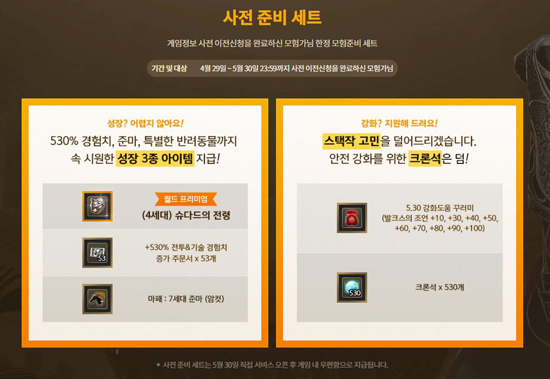 ¸ÕÀú 5¿ù 30ÀÏÀ» À§ÇÑ ¡®»çÀü Áغñ ¼¼Æ®¡¯¸¦ Á¦°øÇÑ´Ù. ¡®»çÀü Áغñ ¼¼Æ®¡¯´Â ÇÑÁ¤ÀûÀ¸·Î ÁغñµÈ »çÀü ÀÌÀü º¸»óÀ¸·Î ¡®ÀüÅõ∙±â¼ú °æÇèÄ¡ 530% Áõ°¡ ÁÖ¹®¼ 53À塯, ¡®4¼¼´ë ¹Ý·Áµ¿¹°¡¯, ¡®7¼¼´ë ¸¶ÆÐ¡¯, ¡®°È ÆÐŰÁö¡¯·Î ±¸¼ºµÅ ÀÖ´Ù. °ËÀº»ç¸· ¼ºñ½º ÀÌÈÄ ÀÌ·± ¿ª´ë±Þ ÇýÅÃÀº ¾ø¾ú´Ù.