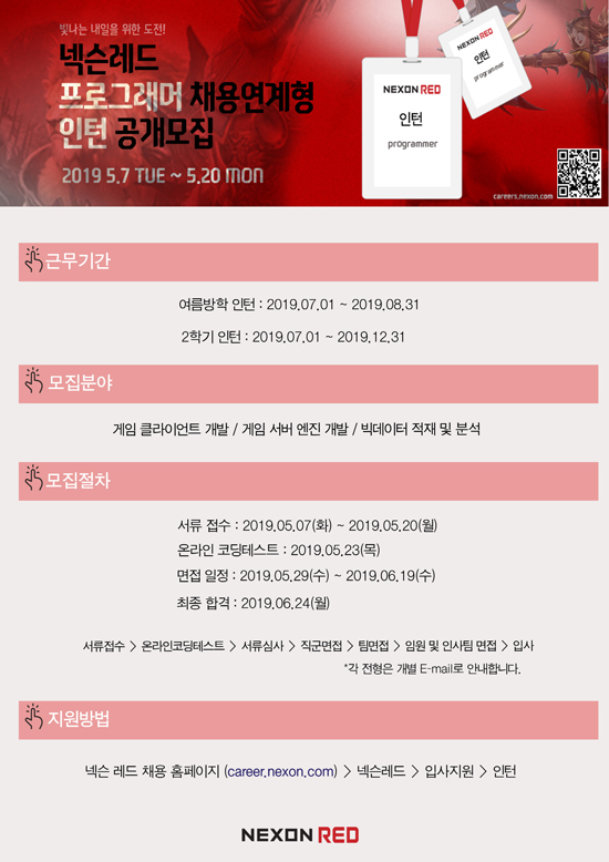 ¸ðÁý ºÐ¾ß´Â ÇÁ·Î±×·¡¹ÖÀÌ´Ù. °ÔÀÓ Å¬¶óÀÌ¾ðÆ® °³¹ß°ú °ÔÀÓ ¼¹ö ¿£Áø °³¹ß, ºòµ¥ÀÌÅÍ ÀûÀç ¹× ºÐ¼® µîÀÇ ¾÷¹«¸¦ ÇÏ°Ô µÈ´Ù. Á÷¹«¿¡ µû¶ó ¿©¸§¹æÇÐ ÀÎÅÏ(7~8¿ù)°ú ¿Ã 12¿ù±îÁö 6°³¿ù°£ ±Ù¹«ÇÏ´Â 2Çбâ ÀÎÅÏÀ¸·Î ³ª´¶´Ù.