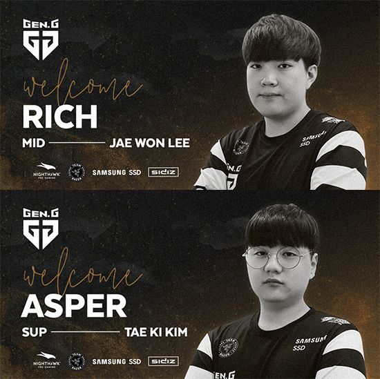 Gen.G LoLÆÀÀÌ ¡®¸®Ä¡(Rich)¡¯ ÀÌÀç¿ø ¼±¼ö¿Í ¡®¾Ö½ºÆÛ(Asper)¡¯ ±èű⠼±¼öÀÇ ½Å±Ô ¿µÀÔÀ» ¹ßÇ¥Çß´Ù. Gen.G e½ºÆ÷Ã÷´Â È÷¾î·ÎÁî ¿Àºê ´õ ½ºÅè(ÀÌÇÏ HotS)ÀÇ Àü¼³ ¡®¸®Ä¡¡¯¿Í Àü ÇÑÈ»ý¸íe½ºÆ÷Ã÷ ¼Æ÷ÅÍ ¡®¾Ö½ºÆÛ¡¯ÀÇ ÇÕ·ù·Î 2019 ¸®±× ¿Àºê ·¹Àüµå èÇǾ𽺠ÄÚ¸®¾Æ (ÀÌÇÏ LCK) ¼¸Ó¿¡ ¾Õ¼ ÆÀ ·Î½ºÅ͸¦ °ÈÇß´Ù. ¶óÀ̾ù °ÔÀÓÁî°¡ ¹ßÇ¥ÇÑ LCK ¼±¼ö ·Î½ºÅÍ¿¡µµ µÎ ¼±¼ö°¡ Æ÷ÇÔµÇ¸é¼ ¿À´Â LCK ¼¸Ó¿¡´Â ¡®¸®Ä¡¡¯¿Í ¡®¾Ö½ºÆÛ¡¯ÀÇ °æ±â¸¦ º¼ ¼öµµ ÀÖ°Ô µÆ´Ù.