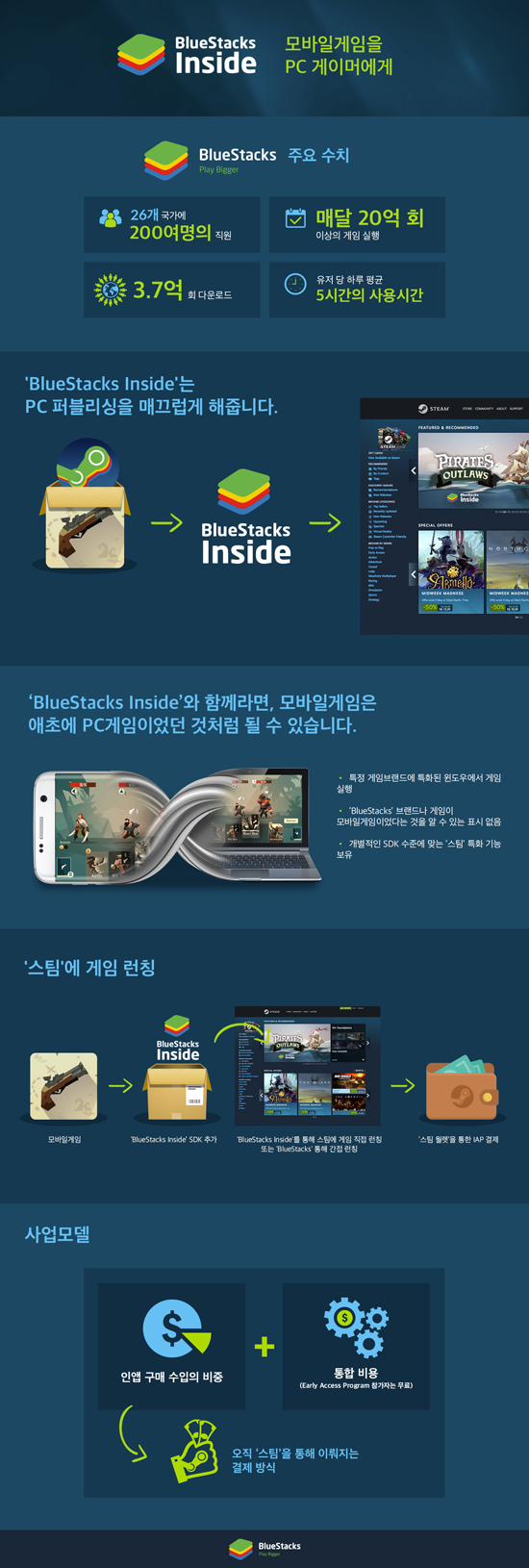 ¡®BlueStacks Inside¡¯´Â ½ºÆÀ(Steam)À̳ª µð½ºÄÚµå(Discord)¿Í °°Àº PC °ÔÀÓ Ç÷§Æû¿¡¼ ¸ð¹ÙÀÏ °ÔÀÓÀ» Áñ±æ ¼ö ÀÖ°Ô ÇÏ´Â SDK(Software Development Kit)ÀÌ´Ù. Ãʱ⿡´Â Äڱ׸¦ ºñ·ÔÇØ ÆÝÇ÷¯½º, Fabled Game Studio¿Í °°ÀÌ Àß ¾Ë·ÁÁø °ÔÀӻ翡¼ Ãâ½ÃÇÏ´Â ¸ð¹ÙÀÏ °ÔÀÓÀ» ½ÃÀÛÀ¸·Î Á¡Â÷ ¹üÀ§¸¦ È®´ëÇØ³ª°¡¸ç ´Ù¾çÇÑ ¸ð¹ÙÀÏ °ÔÀÓÀ» Àü ¼¼°è¿¡¼ °¡Àå ¸¹Àº PC °ÔÀÓ ÀÌ¿ëÀÚ¸¦ º¸À¯ÇÑ ½ºÆÀ¿¡¼ Á÷Á¢ Ç÷¹ÀÌ ÇÒ ¼ö ÀÖµµ·Ï ¸¸µé °èȹÀÌ´Ù.