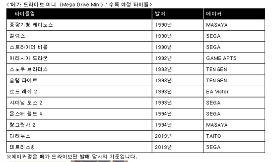 ¼¼°¡ÆÛºí¸®½ÌÄÚ¸®¾Æ´Â 2019³â 9¿ù 19ÀÏ (¸ñ)¿¡ ¹ß¸Å ¿¹Á¤ÀÎ <¸Þ°¡ µå¶óÀÌºê ¹Ì´Ï (Mega Drive Mini)> (¾Æ½Ã¾ÆÆÇ¡Ø) ¸¶Áö¸· ¼ö·Ï ŸÀÌÆ²À» 4Â÷ ¹ßÇ¥¸¦ ÅëÇØ ¹Ì°ø°³ 10 ŸÀÌÆ²°ú ½ÅÀÛ °ÔÀÓ 2 ŸÀÌÆ²À» °ø°³ÇÏ¿´´Ù.