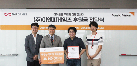 ÀÌ¿£ÇǰÔÀÓÁî´Â 2014³âºÎÅÍ ÇöÀç±îÁö ¿ùµåºñÀüÀ» ÅëÇØ Á¤±âÀûÀ¸·Î ±¹³» ¾Æµ¿À» ÈÄ¿øÇϰí ÀÖÀ¸¸ç, ÈÄ¿ø±Ý 4,810¸¸¿øÀº 2014³âºÎÅÍ 2018³â 12¿ù 31ÀϱîÁö ÀÌ¿£ÇǰÔÀÓÁî°¡ ¼ºñ½ºÇÑ À¥°ÔÀÓ°ú ¸ð¹ÙÀϰÔÀÓ ¡®¹ÝÁö¡¯ µî ¼öÀͱÝÀÇ ÀϺθ¦ ¾î·Á¿î ȯ°æ¿¡ Ã³ÇØ ÀÖ´Â ¿ì¸® ¾ÆÀ̵éÀÇ ²Þ°ú °Ç°ÇÑ ¼ºÀåÀ» À§ÇØ »ç¿ëÇØ ´Þ¶ó´Â Àǹ̸¦ ´ã¾Æ ¿ùµåºñÀü¿¡ Àü´ÞÇÏ¿´´Ù.