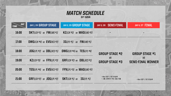 4, 5ÀÏ ¾çÀϰ£ ¿ÀÈÄ 4½ÃºÎÅÍ ÁøÇàµÇ´Â ±×·ì ½ºÅ×ÀÌÁö´Â °¢ ¸®±× º° °°Àº ¼øÀ§¸¦ ±â·ÏÇÑ ÆÀ³¢¸® Çѹø¾¿ ´ÜÆÇÀ¸·Î ¸ÂºÙÀ¸¸ç, ÇÏ·ç¿¡ 6°æ±â¾¿ ÀÌÆ²°£ ÃÑ 12°æ±â°¡ ÆîÃÄÁø´Ù. °³¸·ÀüÀº Áö³ ¡®¹Ìµå ½ÃÁð ÀκñÅ×À̼ųÎ(ÀÌÇÏ MSI)¡¯ 4°Àü¿¡¼ ¾Æ½±°Ô Å»¶ôÀÇ °í¹è¸¦ ¸¶¼Ì´ø LCKÀÇ ¡®SKÅÚ·¹ÄÞ T1¡¯°ú LMSÀÇ ¸ÍÁÖ ¡®Ç÷¡½Ã ¿ïºêÁ °£ÀÇ ´ë°á·Î ÆîÃÄÁø´Ù. ±×·ì ½ºÅ×ÀÌÁö ÁøÇà ÈÄ °¡Àå ¸¹Àº ½Â¸®¸¦ °¡Á®°£ 1À§ Áö¿ªÀº 7ÀÏ ¿¸®´Â °á½Â¿¡ ÁøÃâÇÏ°Ô µÇ¸ç, ³ª¸ÓÁö 2°³ Áö¿ªÀº 6ÀÏ Áذá½ÂÀü¿¡ ÁøÃâÇÑ´Ù.