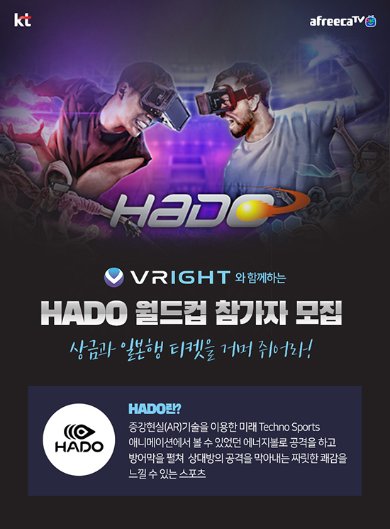 ¾ÆÇÁ¸®Ä«TV´Â 7¿ù 24ÀÏ 3½Ã KT°¡ ¿î¿µÇÏ´Â VRÅ׸¶ÆÄÅ©ÀÎ ºê¶óÀÌÆ®(VRIGHT) ½ÅÃÌÁ¡¿¡¼ ¡®HADO¿ùµåÄÅ¡¯ÃâÀüÀ» À§ÇÑ Çѱ¹´ëȸ¸¦ °³ÃÖÇÑ´Ù°í ¹àÇû´Ù.