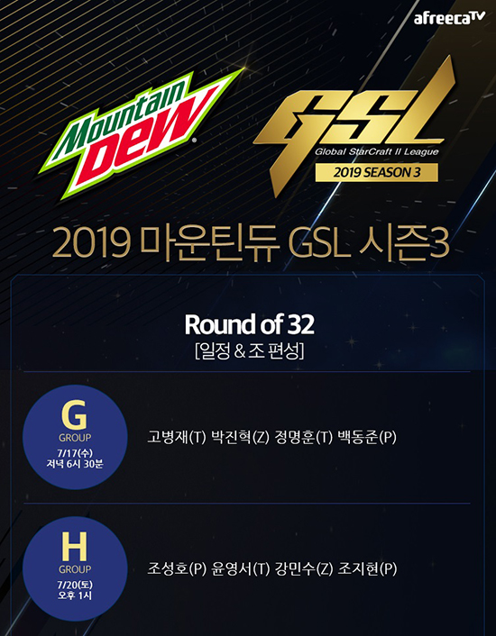 ¾ÆÇÁ¸®Ä«TV´Â 17ÀÏ(¼ö)°ú 20ÀÏ(Åä) ¾çÀϰ£ ¼¿ï ´ëÄ¡µ¿ ÇÁ¸¯¾÷½ºÆ©µð¿À¿¡¼ ¡®2019 ¸¶¿îƾµà GSL(Global Starcraft II League, ÀÌÇÏ GSL) ½ÃÁð3¡¯ ÄÚµåS 32° 3ÁÖ Â÷ °æ±â¸¦ ÁøÇàÇÑ´Ù°í ¹àÇû´Ù. ¾Õ¼ ÁøÇàµÈ 32° 1ÁÖ Â÷ ¹× 2ÁÖ Â÷ °æ±â °á°ú, À̺´·Ä(Rogue), ÈÄ¾È ·ÎÆäÁî(SpeCial), ¹Ú·É¿ì(Dark), ½ÅÈñ¹ü(RagnaroK), ±è´ë¿±(Stats), ±èµµ¿í(Cure), ±èÁØÈ£(herO), ÁÖ¼º¿í(Zest), Àüžç(TY), Á¶¼ºÁÖ(Maru) Ȳ±Ô¼®(KeeN), ±èµµ¿ì(Classic)°¡ 16° ¸í´Ü¿¡ À̸§À» ¿Ã·È´Ù.