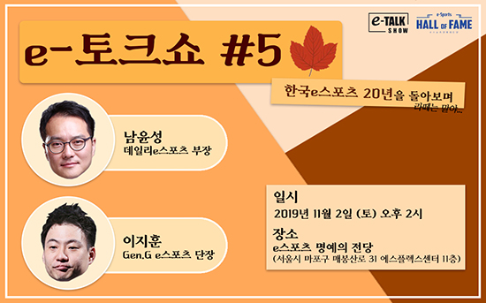 e½ºÆ÷Ã÷ ¸í¿¹ÀÇ Àü´ç¿¡¼­ ÁøÇàµÇ´Â ¡®e-ÅäÅ©¼î(e-Talk show)¡¯´Â e½ºÆ÷Ã÷ °ü°èÀÚµéÀÌ Á÷Á¢ °æÇè´ãÀ» µé·ÁÁÖ°í, ´ëÁßµé°ú ¼ÒÅëÇÏ´Â Á¤±â ÇÁ·Î±×·¥À¸·Î, 5ȸ¸¦ ¸Â¾Ò´Ù. À̹ø e-ÅäÅ©¼î¿¡¼­´Â µµ¼­ ¡®e½ºÆ÷Ã÷ 20³â»ç(2008~2017)¡¯ ¹ß°£À» ±â³äÇØ, Çѱ¹ e½ºÆ÷Ã÷ÀÇ »êÁõÀÎÀÎ Gen.G e½ºÆ÷Ã÷ ÀÌÁöÈÆ ´ÜÀå°ú µ¥Àϸ®e½ºÆ÷Ã÷ÀÇ ³²À±¼º ºÎÀå°ú ÇÔ²² Çѱ¹ÀÇ e½ºÆ÷Ã÷ÀÇ ¹ßÀÚÃ븦 µû¶ó°¡º¼ ¿¹Á¤ÀÌ´Ù. µÎ ¿¬»ç´Â Çѱ¹ e½ºÆ÷Ã÷¿¡¼­ 20³â°£ ÀϾ´ø ´Ù¾çÇÑ »ç°Ç°ú ¾÷ÀûÀ» µ¹¾Æº¸°í, À̸¦ Åä´ë·Î ÇâÈÄ e½ºÆ÷Ã÷ÀÇ ¹æÇ⼺¿¡ ´ëÇØ¼­µµ Âü°ü°´µé°ú »ý°¢À» ³ª´©´Â ½Ã°£À» °®´Â´Ù.