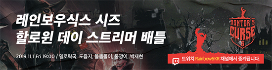 À¯ºñ¼ÒÇÁÆ® ¿£ÅÍÅ×ÀÎ¸ÕÆ®(Ubisoft Entertainment)´Â ÀÚ»çÀÇ Àü¼ú ¸ÖƼÇ÷¹ÀÌ FPS°ÔÀÓ ·¹Àκ¸¿ì½Ä½º ½ÃÁî(Tom Clancy's Rainbow Six Siege)ÀÇ ÇÒ·ÎÀ© µ¥ÀÌ ½ºÆ®¸®¸Ó ¹èƲ À̺¥Æ® ¡®R6S DOKTOR'S CURSE EVENT¡¯¸¦ ¿À´Ã Àú³á 7½ÃºÎÅÍ ÁøÇàÇÑ´Ù°í ¹àÇû´Ù.