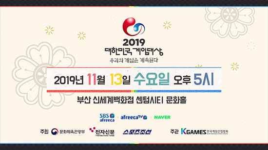 ¹®ÈüÀ°°ü±¤ºÎ, ÀüÀڽŹ®, ½ºÆ÷Ã÷Á¶¼±ÀÌ ÁÖÃÖÇϰí Çѱ¹°ÔÀÓ»ê¾÷Çùȸ°¡ ÁÖ°üÇÏ´Â '2019 ´ëÇѹα¹ °ÔÀÓ´ë»ó'Àº °ÔÀÓ»ê¾÷À» ¹Ì·¡ »ê¾÷À¸·Î À°¼ºÇϰí, °ÔÀÓ Ã¢ÀÛ È°¼ºÈ¸¦ À§ÇØ ÇÑ ÇØ¸¦ ºû³½ °ÔÀÓÀ» °¡¸®´Â ±¹³» ÃÖ°í ±ÇÀ§ÀÇ °ÔÀÓ ½Ã»ó½ÄÀÌ´Ù.