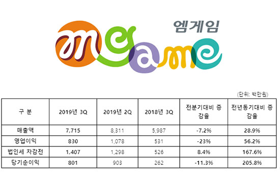 ¿¥°ÔÀÓÀº 2019³â 3ºÐ±â ¿¬°á±âÁØ ¸ÅÃâ 77¾ï¿ø, ¿µ¾÷ÀÌÀÍ 8¾ï¿ø, ´ç±â¼øÀÌÀÍ 8¾ï¿øÀ» ´Þ¼ºÇß´Ù°í 14ÀÏ °ø½ÃÇß´Ù.