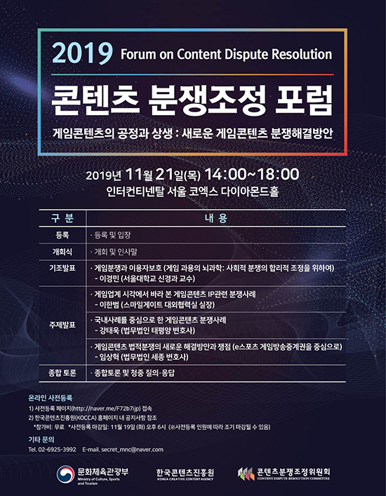À̹ø Æ÷·³Àº ¡®°ÔÀÓÄÜÅÙÃ÷ÀÇ °øÁ¤°ú »ó»ý : »õ·Î¿î °ÔÀÓÄÜÅÙÃ÷ ºÐÀïÇØ°á¹æ¾È¡¯À» ÁÖÁ¦·Î ±Þº¯ÇÏ´Â °ÔÀÓÄÜÅÙÃ÷»ê¾÷ ȯ°æ¿¡¼ÀÇ ´Ù¾çÇÑ ºÐÀï À̽´¸¦ »ìÆìº¸°í, À̸¦ È¿°úÀûÀ¸·Î ´ëÀÀÇϱâ À§ÇÑ ÇØ°á¹æ¾ÈÀ» ¸ð»öÇÒ °èȹÀÌ´Ù. À̹ø Æ÷·³¿¡´Â ÄÜÅÙÃ÷¾÷°è¿Í ºÐÀïÁ¶Á¤¡¤Áö½ÄÀç»ê±Ç(IP)¡¤ÀúÀÛ±Ç µî ¹ýÁ¶°è Àü¹®°¡, °ÔÀÓ»ê¾÷ °ü°èÀÚµéÀÌ ´ë°Å Âü¿©ÇÑ´Ù.