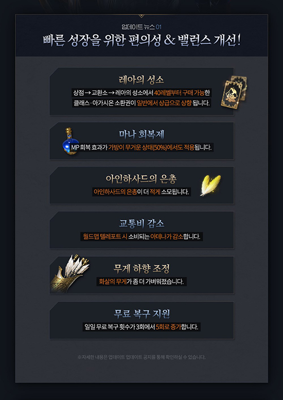¸®´ÏÁö2MÀº ÀÌ¿ëÀÚµéÀÇ ÀǰßÀ» ¼ö·ÅÇØ ¾÷µ¥ÀÌÆ®¸¦ ÁøÇàÇß´Ù. °ÔÀÓ ÃÊ¹Ý Ç÷¹ÀÌÀÇ ³À̵µ¸¦ ³·Ãß±â À§ÇØ ÀÌ¿ëÀÚ ÆíÀǼºÀ» ´ëÆø °³¼±Çß´Ù. »ç³ÉÀ» ÇÒ ¶§ ´õ ¸¹Àº °æÇèÄ¡¿Í ¾Æµ¥³ª¸¦ ȹµæÇÏ°Ô ÇÏ´Â ¡®¾ÆÀÎÇÏ»çµåÀÇ ÀºÃÑ¡¯ ¼Ò¸ð·®À» ÁÙ¿´´Ù. ¿ùµå¸Ê ÅÚ·¹Æ÷Æ®¿¡ ÇÊ¿äÇÑ ºñ¿ëÀ» ³·Ãè´Ù. È»ì µî ÁÖ¿ä ¾ÆÀÌÅÛÀÇ ¹«°Ô¸¦ ÁÙ¿´´Ù. ¾Æµ¥³ª·Î ±¸ÀÔ °¡´ÉÇÑ Å¬·¡½º, ¾Æ°¡½Ã¿Â ¼Òȯ±ÇÀÇ µî±ÞÀ» »óÇâÇß´Ù. ½ÅŹ ¾ÆÀÌÅÛÀ» °øÀ¯ÇÒ ¼ö ÀÖ´Â ÀοøÀ» µÎ¹è·Î ´Ã·È´Ù. ÀÌ¿ëÀÚµéÀº ij¸¯ÅÍ »ç¸Á ½Ã Ç϶ôÇÑ °æÇèÄ¡¸¦ ´Ù¼¸¹ø ¹«·á·Î º¹±¸ÇÒ ¼ö ÀÖ´Ù.