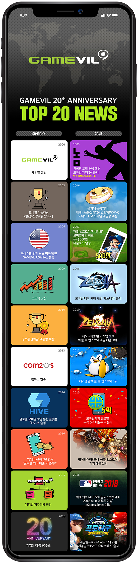 °ÔÀÓºôÀÌ Ã¢¸³ 20ÁÖ³âÀ» ¸Â¾Æ ¡®TOP 20 NEWS¡¯ ÀÎÆ÷±×·¡ÇÈÀ» °ø°³Çß´Ù. 2000³â 1¿ù 10ÀÏ Ã¢¸³ÇÑ °ÔÀÓºôÀº 2020³âÀ» ¸Â¾Æ µµ¾àÇÏ´Â 20³âÀ» ´ÙÁüÇϰí ÀÖ´Ù.