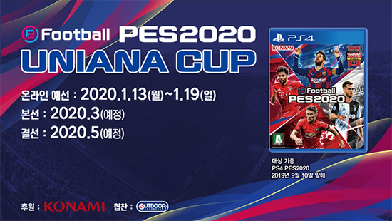 À¯´Ï¾Æ³ª´Â PES 2020 ±¹³» °ø½Ä ´ëȸ ¡®eFootball PES 2020 UNIANA CUP(ÀÌÇÏ UNIANA CUP)¡¯ ¿Â¶óÀÎ ¿¹¼±À» 1¿ù 13ÀÏ(¿ù)ºÎÅÍ PlayStation¢ç4 PES 2020[Çѱ¹¾îÆÇ]¿¡¼ ÁøÇàÇÑ´Ù°í ¹ßÇ¥Çß´Ù.[À¯´Ï¾Æ³ª ÁÖÃÖ∙ÁÖ°ü]