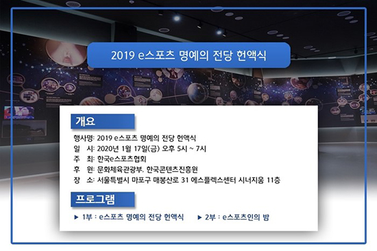 Çѱ¹e½ºÆ÷Ã÷Çùȸ(www.e-sports.or.kr)°¡ ÁÖÃÖÇÏ°í ¹®ÈüÀ°°ü±¤ºÎ¿Í Çѱ¹ÄÜÅÙÃ÷ÁøÈï¿øÀÌ ÈÄ¿øÇÏ´Â ¡®2019 e½ºÆ÷Ã÷ ¸í¿¹ÀÇ Àü´ç Çå¾×½Ä¡¯ÀÌ ¿À´Â 17ÀÏ(±Ý) ¿ÀÈÄ 5½Ã e½ºÆ÷Ã÷ ¸í¿¹ÀÇ Àü´ç¿¡¼ ¿¸°´Ù.