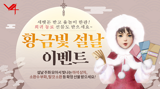 ¡®V4¡¯¿¡¼´Â Áö³ 21ÀϺÎÅÍ ¡®È²±Ýºû ¼³³¯ À̺¥Æ®¡¯¸¦ ÁøÇàÇϰí ÀÖ´Ù. ÀÌ¿ëÀÚ´Â ¡®V4¡¯ °ø½Ä ȨÆäÀÌÁö¿¡¼ ¼¼¹îµ·À» ã¾Æ °ÔÀÓ ÀçÈÀÎ °ñµå¿Í ±³È¯ÇÒ ¼ö ÀÖÀ¸¸ç, À·³îÀÌ À̺¥Æ®·Î ¼³³¯ ÁÖȸ¦ ¸ðÀ¸¸é ¡®Èñ±Í µ¿·á¡¯, ¡®ºû³ª´Â ¸¶¼® »óÀÚ', '¼Òȯ¼ö ºÎÈ' µî º¸»ó ¾ÆÀÌÅÛÀ» ȹµæÇÒ ¼ö ÀÖ´Ù.