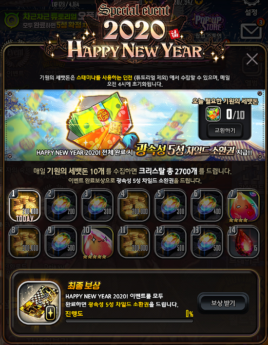 ±ÝÀϺÎÅÍ ¿À´Â 2¿ù 13ÀϱîÁö ¡®±â¿øÀÇ ¼¼¹îµ·¡¯À» ¸ð¾Æ dz¼ºÇÑ ÇýÅÃÀ» ¹Þ¾Æ°¥ ¼ö ÀÖ´Â ¡®HAPPY NEW YEAR 2020!¡¯ À̺¥Æ®°¡ ÁøÇàµÈ´Ù. ¡®±â¿øÀÇ ¼¼¹îµ·¡¯Àº Æ©Å丮¾óÀ» Á¦¿ÜÇÑ ½ºÅ¹̳ʸ¦ »ç¿ëÇÏ´Â ´øÀü¿¡¼ ȹµæ °¡´ÉÇϸç, ¸ÅÀÏ 10°³¸¦ ¸ð¾Æ ÄÝ·ºÆ®¸¦ ¿Ï¼ºÇØ Å©¸®½ºÅ» 2,700°³¿Í ºí·¯µåÁª, °ñµå µîÀ» ¾òÀ» ¼ö ÀÖ´Ù. ÃÖÁ¾ º¸»óÀ¸·Î´Â ±¤¼Ó¼º 5¼º Â÷ÀÏµå ¼Òȯ±ÇÀÌ ÁÖ¾îÁø´Ù.