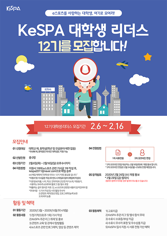 ¡®KeSPA ´ëÇлý ¸®´õ½º¡¯ 12±â°¡ 6ÀÏ(¸ñ)ºÎÅÍ ¸ðÁýÀ» ½ÃÀÛÇÑ´Ù.
