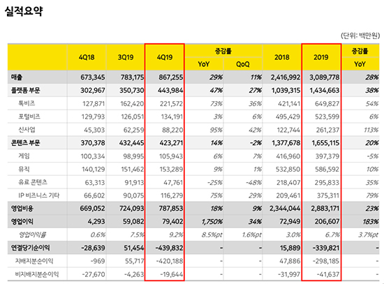 īī¿À´Â K-IFRS(Çѱ¹±¹Á¦È¸°è±âÁØ) ±âÁØ 2019³â ¿¬°£ ¸ÅÃâÀÌ Àü³â ´ëºñ 28% »ó½ÂÇÑ 3Á¶ 898¾ïÀ» ±â·ÏÇÏ¸ç ¿ª´ë ÃÖ°í ¸ÅÃâÀ» ¶Ç Çѹø °æ½ÅÇß´Ù°í ¹àÇû´Ù. 4ºÐ±â ¿¬°á ¸ÅÃâÀº ÀüºÐ±â ´ëºñ 11%, Àü³â µ¿±â ´ëºñ 29% Áõ°¡ÇÑ 8,673¾ïÀ¸·Î Áý°èµÆ´Ù. īī¿ÀÅå Áß½ÉÀÇ ºñÁî´Ï½º ±¸Á¶ ¾ÈÂø°ú ½Å±Ô »ç¾÷ÀÇ ¼öÀÍ ¸ðµ¨ È®´ë°¡ ¿ª´ë ÃÖ°í ¸ÅÃâ°ú ÀÌÀÍÀ¸·Î À̾îÁ³´Ù.