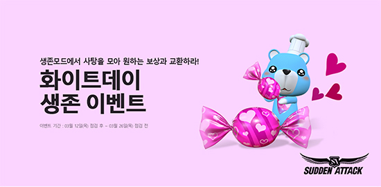¡®¼µç¾îÅ᯿¡¼´Â ÆÄ¹Ö ³À̵µ ÇÏÇâ, ½Å±Ô ¹«±â Ãß°¡ µîÀ» ÅëÇØ ´õ¿í ½±°Ô °³ÆíµÈ »ýÁ¸¸ðµå ¡®Á¦32±¸¿ª¡¯, ¡®½Ã¹ü´ÜÁö¡¯, ¡®ÆÄÀ̳ÎÁ¸¡¯¿¡¼ 3¿ù 26ÀϱîÁö ÇÊµå µå¶øµÈ »çÅÁÀ» ¸ðÀ» ½Ã °³¼ö¿¡ µû¶ó ¡®º¸Á¶ ±â°£¿¬Àå ¿µ±¸Á¦¡¯¿Í ¡®Äµµð ¼ö·ùź ¿µ±¸Á¦¡¯´Â 1ȸ¾¿, 3¸¸ ÅëÇÕ °æÇèÄ¡´Â ÃÖ´ë 10ȸ±îÁö ±³È¯ÇÒ ¼ö ÀÖ´Ù. ¶ÇÇÑ, 3¿ù 18ÀϱîÁö °Ü¿ï ¾÷µ¥ÀÌÆ® °¨»ç À̺¥Æ®·Î ¸ÅÀÏ ¿ÀÈÄ 3½ÃºÎÅÍ 9½Ã »çÀÌ Á¤°¢¸¶´Ù °ÔÀÓÀ» Áñ±â¸é ¡®Àá°ÜÁø ¿µ±¸Á¦ BOX¡¯, ¡®M4A1(IS) Flower(¿µ±¸Á¦)¡¯, ¡®NA-94 ¸¶¹ýºÀ(¿µ±¸Á¦)¡¯ µîÀ» Áï½Ã º¸»óÀ¸·Î Á¦°øÇÑ´Ù.