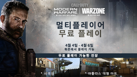 ¿ì¼±, ³»ÀÏ 4¿ù 4ÀÏ (Åä) ¿ÀÀü 2½ÃºÎÅÍ 4¿ù 7ÀÏ (È) ¿ÀÀü 2½Ã±îÁö ¸¸ »çÈê µ¿¾È(ÀÌÇÏ ¸ðµÎ Çѱ¹ ½Ã°£ ±âÁØ), º» °ÔÀÓ(full version)À» ±¸¸ÅÇÏÁö ¾ÊÀº ÆÒµéµµ ¸ð´ø ¿öÆä¾î ¸ÖƼÇ÷¹ÀÌ¾î ¸ðµå¸¦ ¹«·á·Î Áñ±â°í üÇèÇØ º¼ ¼ö ÀÖ´Ù. À̹ø ¹«·á Ç÷¹ÀÌ ±â°£¿¡ Âü¿©ÇÏ´Â ÆÒµéÀº 6:6 ´ë°áÀÌ ¹ú¾îÁö´Â »ç°ÝÀå(Shoot House)°ú 10:10 ±³Àü¿¡ ¸ÂÃçÁø ¾ÆÆ²¶ó½º ´ëÇü ¸¶Æ®(Atlas Superstore) µî µÎ °÷ÀÇ ÀüÀåÀ» ¹è°æÀ¸·Î, ÆÀ µ¥½º¸ÅÄ¡(Team Deathmatch), Á¡·É(Domination) ¼ö»ö ¼¶¸ê(Hardpoint) µî°ú °°Àº ´Ù¾çÇÑ ÆÀ ±â¹Ý °ÔÀÓ °æÇèÀ» Áñ±æ ¼ö ÀÖ´Ù.