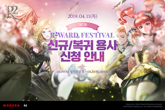À¥Á¨Àº 4¿ù 9ÀÏ(¸ñ) ¡®R2WARD FESTIVAL 2020¡¯ÀÇ Æ¼Â¡ ÆäÀÌÁö¸¦ ¿°í, ¼ºñ½º ÃʱâºÎÅÍ R2¸¦ Áñ°Ü¿Â ȸ¿øµéÀÌ ´Ù½Ã Çѹø Áñ°Ì°Ô °ÔÀÓÀ» Ç÷¹ÀÌÇÒ ¼ö ÀÖµµ·Ï 4¿ù 20ÀÏ(¿ù) 00½Ã±îÁö ¡®½Å±Ô/º¹±Í¡¯ ½Åû À̺¥Æ®¸¦ ÁøÇàÇÑ´Ù.
