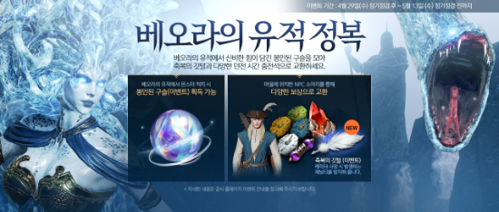 ¿£¾¾(NC)´Â ¡®º£¿À¶óÀÇ À¯Àû Á¤º¹¡¯ À̺¥Æ®¸¦ ÁøÇàÇÑ´Ù. ÀÌ¿ëÀÚ´Â 5¿ù 13ÀϱîÁö ¡®º£¿À¶óÀÇ À¯Àû¡¯ ´øÀü¿¡¼ ¸ó½ºÅ͸¦ Ã³Ä¡ÇØ ¡®ºÀÀÎµÈ ±¸½½¡¯À» ¸ðÀ» ¼ö ÀÖ´Ù. ¡®ºÀÀÎµÈ ±¸½½¡¯Àº °¢ ¸¶À»ÀÇ ¡®¼ÒÀ̸®¡¯ NPC(Non-Player Character)¸¦ ÅëÇØ ´Ù¾çÇÑ ¾ÆÀÌÅÛÀ¸·Î ±³È¯ÇÒ ¼ö ÀÖ´Ù.