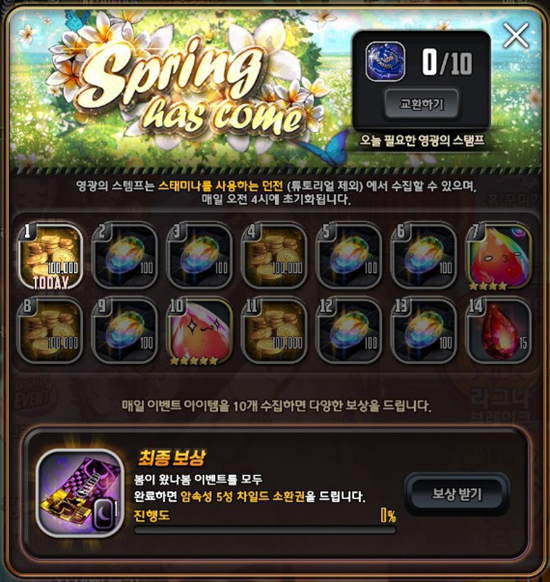 4¿ù 30ÀϺÎÅÍ 5¿ù 21ÀϱîÁö ¡®¿µ±¤ÀÇ ½ºÅÆÇÁ¡¯¸¦ ¸ð¾Æ dz¼ºÇÑ ÇýÅÃÀ» ¾òÀ» ¼ö ÀÖ´Â ¡®º½ÀÌ ¿Ô³ªº½¡¯ À̺¥Æ®°¡ ÁøÇàµÈ´Ù. ¡®¿µ±¤ÀÇ ½ºÅÆÇÁ¡¯´Â ½ºÅ¹̳ª¸¦ »ç¿ëÇÏ´Â ´øÀü¿¡¼ ȹµæ °¡´ÉÇϸç, ¸ÅÀÏ 10°³¸¦ ¸ð¾Æ ÄÝ·ºÆ®¸¦ ¿Ï¼ºÇϸé Å©¸®½ºÅ»°ú ºí·¯µåÁª, °ñµå µîÀ» ¾òÀ» ¼ö ÀÖ´Ù. ÃÖÁ¾ º¸»óÀ¸·Î ¾Ï¼Ó¼º 5¼º Â÷ÀÏµå ¼Òȯ±ÇÀÌ ÁÖ¾îÁø´Ù.