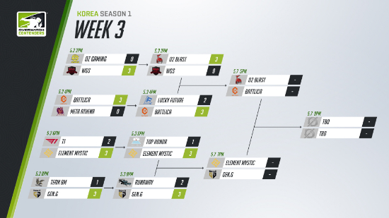 °á½ÂÀü¿¡ ¾Õ¼ ¿ÀÈÄ 5½ÃºÎÅÍ 4° °æ±â°¡ ÆîÃÄÁø´Ù. 4°¿¡´Â 'O2 ºí¶ó½ºÆ®', '¹èƲ¸®Ä«', '¿¤¸®¸ÕÆ® ¹Ì½ºÆ½', 'Gen.G' µî ÃÑ 4ÆÀÀÌ ÁøÃâÇß´Ù. ¸ÕÀú 2ÁÖÂ÷ ¿ì½ÂÆÀÀÎ O2 ºí¶ó½ºÆ®¿Í ¿À¹ö¿öÄ¡ ÄÁÅÙ´õ½º Æ®¶óÀ̾󿡼ºÎÅÍ °ÆÀµéÀ» ²ª°í ¿Ã¶ó¿Â ¹èƲ¸®Ä«ÀÇ 4° 1°æ±â°¡ ½ÃÀ۵ȴÙ. À̾î ÇöÀç °øµ¿ 4À§¸¦ ±â·ÏÁßÀÎ ¿¤¸®¸ÕÆ® ¹Ì½ºÆ½°ú Gen.G°¡ 4° 2°æ±â¿¡¼ ¸ÂºÙÀ¸¸ç, ¼øÀ§ »ó½ÂÀ» À§ÇÑ °æÀïÀ» ÆîÄ¥ ¿¹Á¤ÀÌ´Ù.