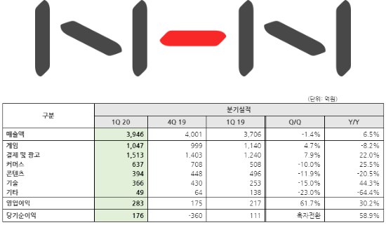 NHNÀÇ 2020³â 1ºÐ±â ¸ÅÃâÀº Àü³â µ¿±â ´ëºñ 6.5% Áõ°¡ÇÑ 3,946¾ï¿ø, ¿µ¾÷ÀÌÀÍÀº 30.2% ¿À¸¥ 283¾ï¿ø, ´ç±â¼øÀÌÀÍÀº 58.9% »ó½ÂÇÑ 176¾ï¿øÀ» ±â·ÏÇß´Ù.