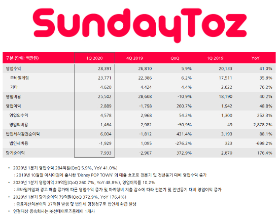 ¼±µ¥ÀÌÅäÁî°¡ 2020³â 1ºÐ±â ½ÇÀûÀ» 12ÀÏ ¹ßÇ¥Çß´Ù. ¸ÅÃâ 284¾ï ¿ø, ¿µ¾÷ÀÌÀÍ 29¾ï ¿ø, ´ç±â¼øÀÌÀÍ 79¾ï ¿øÀ» ±â·ÏÇÑ 1ºÐ±â ½ÇÀûÀº Á÷Àü ºÐ±â ´ëºñ ¸ÅÃâ 5.9%, ¿µ¾÷ÀÌÀÍ 261%, ´ç±â¼øÀÌÀÍ 373% µî Å« ÆøÀÇ ¼ºÀå¼¼¸¦ ±â·ÏÇß´Ù. ÀÌ´Â ±¹³»¿Ü ÁÖ¿ä °ÔÀÓµéÀÇ °ßÁ¶ÇÑ ¸ÅÃâ°ú Àü³â 4ºÐ±â ÇØ¿Ü¿¡ Ãâ½ÃÇÑ ¡®µðÁî´Ï ÆË Ÿ¿î¡¯ÀÇ ½ÃÀå ¾ÈÂø¿¡ µû¸¥ ¸¶ÄÉÆÃ ºñ¿ë °¨¼Ò°¡ ¹è°æÀ¸·Î ºÐ¼®µÈ´Ù.