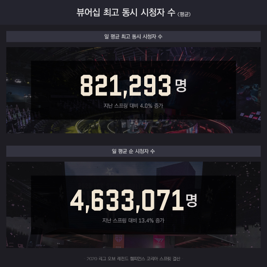 2020 LCK ½ºÇÁ¸µÀº Äڷγª19 ¿©ÆÄ·Î ÀÎÇØ ¸®±× °³¸·°ú µ¿½Ã¿¡ ¹«°üÁßÀ¸·Î °æ±â¸¦ ÁøÇàÇßÀ½¿¡µµ ºÒ±¸Çϰí 2019 LCK ½ºÇÁ¸µ ´ëºñ ÀÏ Æò±Õ ¼ø ½ÃûÀÚ ¼ö°¡ 13.4% Áõ°¡ÇÑ 463¸¸¿© ¸íÀ» ±â·ÏÇß´Ù. ÀÏ Æò±Õ ÃÖ°í µ¿½Ã ½ÃûÀÚ ¼ö ¿ª½Ã Àü³â µ¿±â ´ëºñ 4% Áõ°¡ÇÑ 82¸¸¿© ¸íÀ¸·Î Áý°èµÇ´Â µî Äڷγª19 ¿©ÆÄ¿¡µµ ºÒ±¸ÇÏ°í ºñ´ë¸éÀ¸·Îµµ Áñ±æ ¼ö ÀÖ´Â e½ºÆ÷Ã÷ÀÇ ÀåÁ¡À» LCK°¡ È¿°úÀûÀ¸·Î Ȱ¿ëÇß´Ù´Â ÆòÀÌ´Ù. »Ó¸¸ ¾Æ´Ï¶ó LCKÀÇ À̹ø ½ºÇÁ¸µ ½ºÇø´ ÃÖ°í µ¿½Ã Á¢¼ÓÀÚ ¼ö 82¸¸¿© ¸í °¡¿îµ¥ ¾à 62%°¡ ÇØ¿Ü ½ÃûÀÚ ¼ö(¾à 51¸¸¿© ¸í)·Î Áý°èµÇ¸é¼, ±¹³» »Ó ¾Æ´Ï¶ó ÇØ¿Ü¿¡¼µµ ã¾Æº¸´Â Àα⠽ºÆ÷Ã÷ ÄÜÅÙÃ÷ÀÓÀ» ´Ù½Ã Çѹø È®ÀÎÇß´Ù.