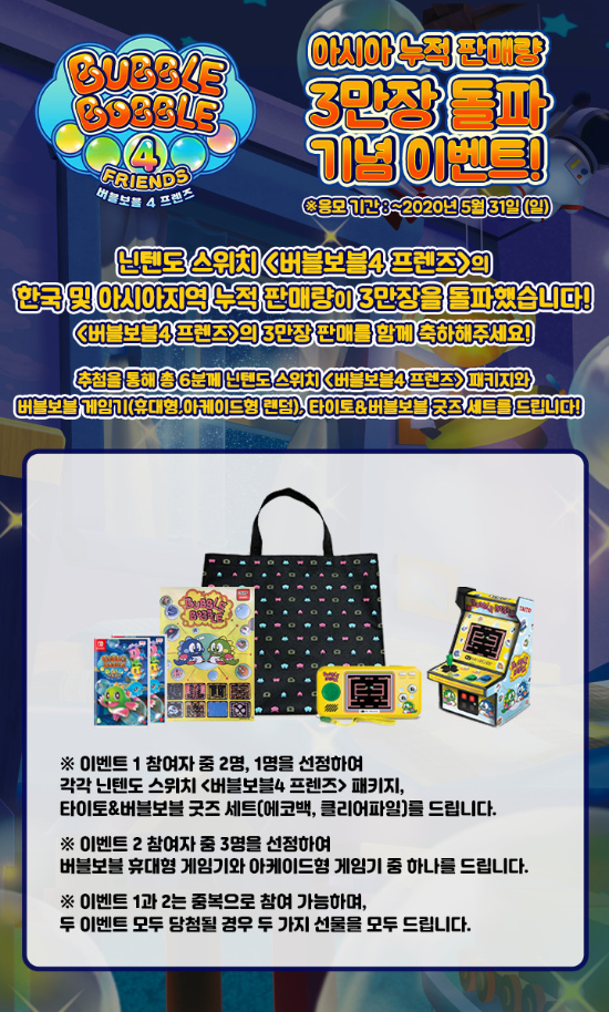 ¡¸¹öºíº¸ºí 4 ÇÁ·»Á ´©Àû ÆÇ¸Å·® 3¸¸Àå µ¹ÆÄ ±â³ä À̺¥Æ®´Â ¿À´Ã(5¿ù 18ÀÏ)ºÎÅÍ 5¿ù 31ÀϱîÁö ÁøÇàµÇ¸ç, °æÇ°À¸·Î´Â ¡®¡¸¹öºíº¸ºí 4 ÇÁ·»Á ´ÑÅÙµµ ½ºÀ§Ä¡ Çѱ¹¾îÆÇ ÆÐŰÁö¡¯¿Í ¡®¹öºíº¸ºí ÈÞ´ëÇü °ÔÀÓ±â ¹× ¾ÆÄÉÀ̵åÇü °ÔÀӱ⡯, ±×¸®°í ¡®Å¸ÀÌÅä&¹öºíº¸ºí ±ÂÁî ¼¼Æ®¡¯¸¦ À̺¥Æ®¿¡ Âü¿©ÇÑ 6¸í¿¡°Ô Ãß÷À» ÅëÇØ ÁõÁ¤ÇÒ ¿¹Á¤ÀÌ´Ù.