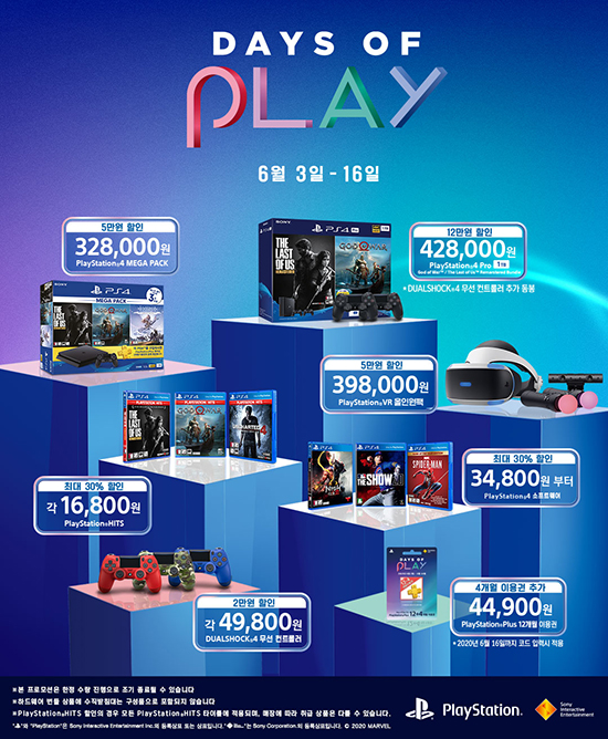 ¼Ò´ÏÀÎÅÍ·¢Æ¼ºê¿£ÅÍÅ×ÀÎ¸ÕÆ®ÄÚ¸®¾Æ(SIEK)´Â 2020³â 6¿ù 3ÀÏ(¼ö)ºÎÅÍ 2020³â 6¿ù 16ÀÏ(È)±îÁö 2ÁÖ µ¿¾È PlayStation¢ç Çϵå¿þ¾î, ÁÖº¯±â±â, ¼ÒÇÁÆ®¿þ¾î ¹× ³×Æ®¿öÅ© ¼ºñ½º Àü¹Ý¿¡ °ÉÃÄ Æ¯º°ÇÑ ÇÒÀÎÀ» Á¦°øÇÏ´Â ¡®Days of Play¡¯ ¼¼ÀÏÀ» ÁøÇàÇÑ´Ù.