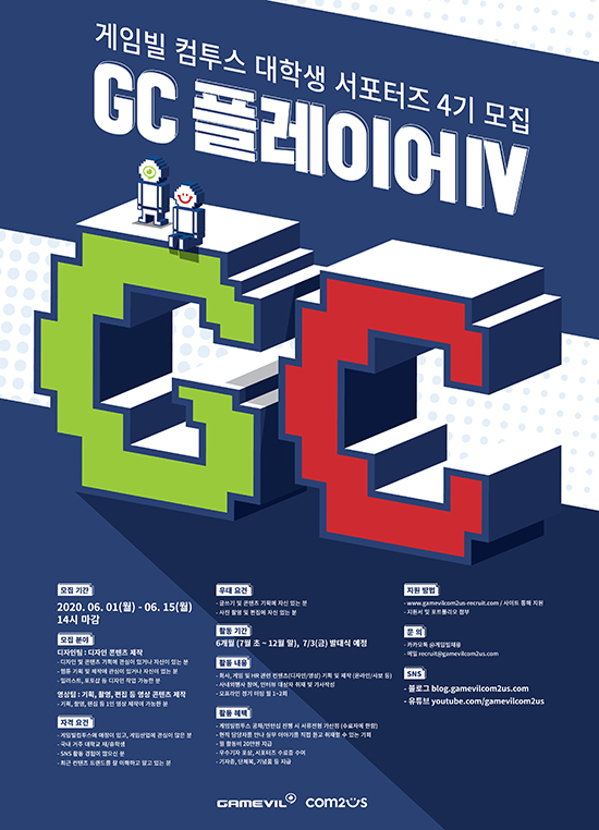 °ÔÀÓºô-ÄÄÅõ½º°¡ °øµ¿À¸·Î ÁøÇàÇÏ´Â ¡®GC Ç÷¹À̾´Â °ÔÀÓºô°ú ÄÄÅõ½º¿¡ °ü½ÉÀÌ ¸¹Àº ´ëÇлý(ÈÞÇлý °¡´É)À̶ó¸é ´©±¸µçÁö Áö¿øÇÒ ¼ö ÀÖÀ¸¸ç, °ø½Ä ä¿ë ȨÆäÀÌÁö(http://www.gamevilcom2us-recruit.com/)¸¦ ÅëÇØ ÀÌ´Þ 15ÀϱîÁö Áö¿ø¼¸¦ ¹Þ´Â´Ù. ¼±¹ßµÈ ¡®GC Ç÷¹À̾ 4±â´Â 7¿ù 3ÀÏ ¹ß´ë½ÄÀ» ½ÃÀÛÀ¸·Î ¾à 6°³¿ù °£ ¾ç»çÀÇ °ÔÀÓ ¹× ä¿ë ÄÜÅÙÃ÷¸¦ ºñ·ÔÇØ ȸ»ç ³»ºÎÀÇ ´Ù¾çÇÑ ¼Ò½ÄÀ» ´ëÇлýÀÇ ½Ã°¢¿¡¼ ¾Ë¸®´Â ¿ªÇÒÀ» ¼öÇàÇÑ´Ù.