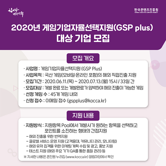 Áö¿ø ³»¿ëÀº ±¹»ê °ÔÀÓÀÇ ÇØ¿Ü½ÃÀå ÁøÃâ¿¡ ÇÊ¿äÇÑ ÇöÁöÈ ‧ ¸¶ÄÉÆÃ ‧ ÀÎÇÁ¶ó ºÐ¾ß·Î ¡ã°ÔÀÓ ÄÜÅÙÃ÷ ¾ð¾î ¹ø¿ª Áö¿ø ¡ã±Û·Î¹ú °ÔÀÓ ¿î¿µ Áö¿ø ¡ã°ÔÀÓ Ç°Áú°ü¸® Å×½ºÆ® Áö¿ø ¡ã±¤°í¡¤ÇÁ·Î¸ð¼Ç µî ¸¶ÄÉÆÃ Áö¿ø ¡ã¼¹ö ¹× º¸¾È ±â¼ú Áö¿ø ¡ã°ÔÀÓ ÄÜÅÙÃ÷ ¹× ÇØ¿Ü½ÃÀå Á¶»ç ÄÁ¼³ÆÃ µî ¼¼ºÎ Áö¿ø Ç׸ñº° Àü¹® ¾÷ü¸¦ ÅëÇÑ ¼ºñ½º¸¦ ¹ÞÀ» ¼ö ÀÖ´Ù.