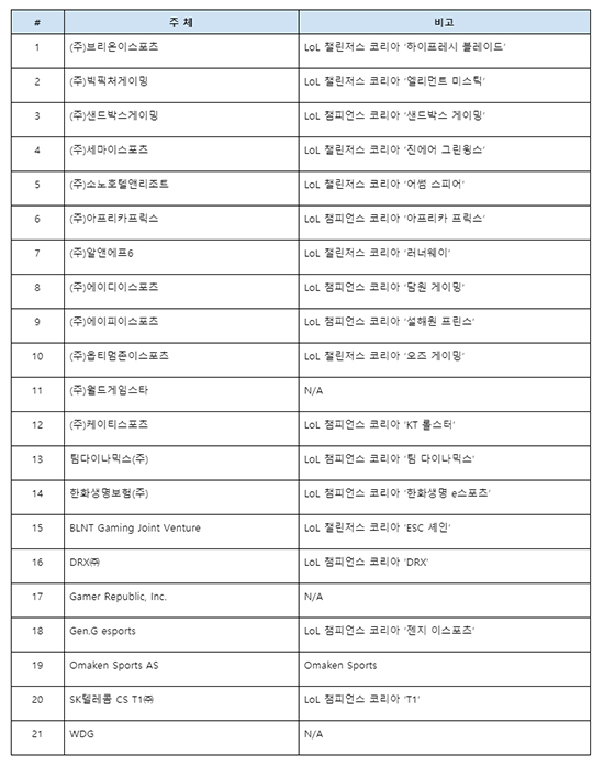 ¶óÀ̾ù °ÔÀÓÁî(www.leagueoflegends.co.kr)´Â Áö³ 19ÀÏ ¸¶°¨µÈ '2021 ¸®±× ¿Àºê ·¹Àüµå èÇǾ𽺠ÄÚ¸®¾Æ'(ÀÌÇÏ LCK) ÇÁ·£Â÷ÀÌÁî Âü°¡ ÆÀ ¸ðÁý¿¡ ÃÑ 21°³ ±â¾÷ÀÌ Áö¿ø¼¸¦ Á¦ÃâÇß´Ù°í ¹àÇû´Ù.