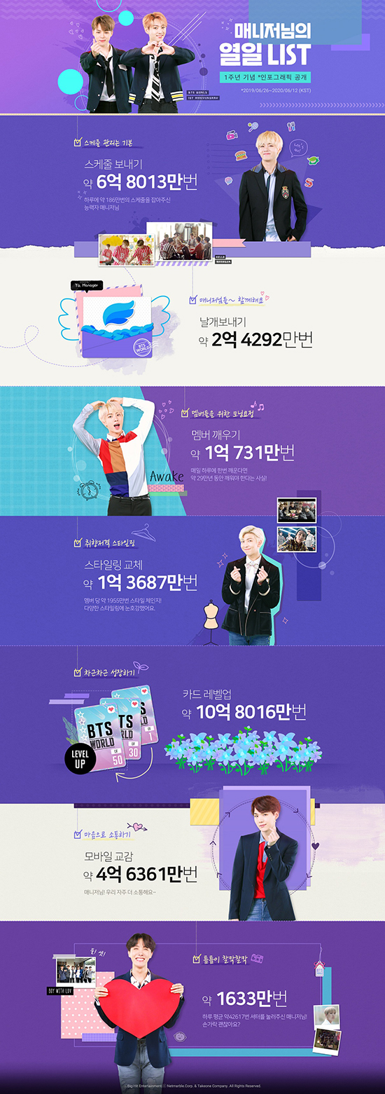 ³Ý¸¶ºíÀº ¹æÅº¼Ò³â´Ü ¸Å´ÏÀú °ÔÀÓ ¡®BTS ¿ùµå(BTS WORLD, °³¹ß»ç Å×ÀÌÅ©¿øÄÄÆÛ´Ï)¡¯ÀÇ Ãâ½Ã 1ÁÖ³âÀ» ±â³äÇØ ¡®¸Å´ÏÀú´ÔÀÇ ¿ÀÏ ¸®½ºÆ®¡¯ ÄܼÁÆ®ÀÇ ÀÎÆ÷±×·¡ÇÈÀ» ¹ßÇ¥Çϰí, ÀÌ¿ëÀÚ¿¡°Ô ´Ù¾çÇÑ ÇýÅðú º¸»óÀ» Á¦°øÇÏ´Â À̺¥Æ®¸¦ ½Ç½ÃÇÑ´Ù°í ¹àÇû´Ù.