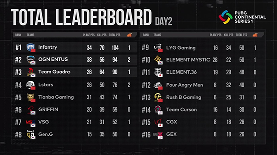 6¿ù 26ÀÏ(±Ý)°ú 28ÀÏ(ÀÏ) ÁøÇàµÈ 1ÁÖ Â÷ °æ±â °á°ú, Ãִ٠ų ¼ö¸¦ ±â·ÏÇÏ¸ç °¼¼¸¦ º¸ÀÎ Áß±¹ÀÇ Infantry°¡ 70ų 104Æ÷ÀÎÆ®·Î 1À§¿¡ ¿Ã¶ú´Ù. 28ÀÏ °æ±â¿¡¼ ÇÏ·ç ¸¸¿¡ µÎ ¹øÀÇ ¸ÅÄ¡ ¿ì½ÂÀ» Â÷ÁöÇÑ OGN ENTUS(OGN ¿£Åõ½º)´Â 56ų 94Æ÷ÀÎÆ®·Î 2À§±îÁö ¼øÀ§¸¦ ²ø¾î¿Ã·È´Ù. Team Quadro(ÆÀ Äõµå·Î)°¡ 3À§·Î ±× µÚ¸¦ ÀÌÀ¸¸ç, Çѱ¹ ÆÀ Áß 2°³ ÆÀÀÌ »óÀ§±Ç¿¡ ¾ÈÂøÇß´Ù.