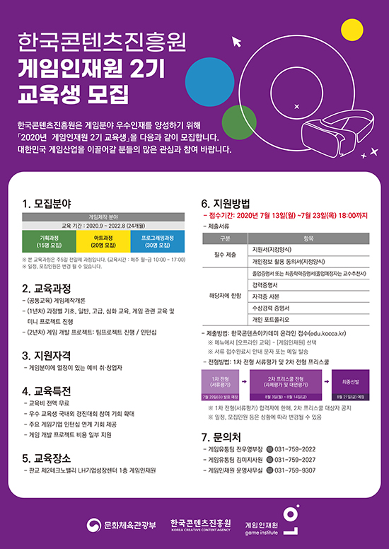 ¹®ÈüÀ°°ü±¤ºÎ¿Í Çѱ¹ÄÜÅÙÃ÷ÁøÈï¿ø(ÄÜÁø¿ø)Àº ´ëÇѹα¹ °ÔÀÓ»ê¾÷ÀÇ ¹Ì·¡¸¦ À̲ø ¿ì¼öÀÎÀ縦 ¾ç¼ºÇϱâ À§ÇØ ¡®2020³â °ÔÀÓÀÎÀç¿ø 2±â¡¯ ±³À°»ýÀ» ¿À´Â 23ÀϱîÁö ¸ðÁýÇÑ´Ù.